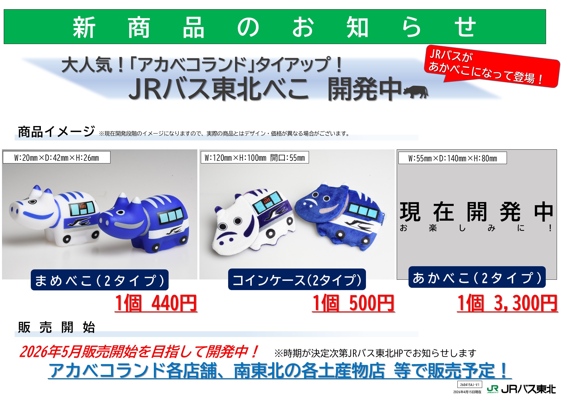 弊社では、ふくしまDC開催に併せ地元福島の「アカベコランド」とタイアップし、弊社のバスをモデルに赤べこに落とし込んだ各種「JRバス東北べこ」商品を現在開発中です。